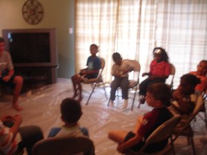 But despite thoughts to cancel, we had the Easter Outreach Party at our house anyway. The rain dictated that we have most of it actually ‘in our house.’ We swept out the garage and turned it into a 4 square area. That kept the kids occupied for a bit until we headed inside for the gospel lesson.