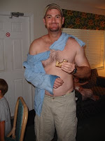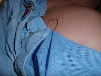 I looked in the mirror and saw no velcro. I did however see a fish hook. So I went to Amy to ask her to pull it out. Unless it was too deep. Well it was. The barb was totally in my back. Believe me. The hook was a “worm hook” so that’s the curve of the hook you see in the pic: not the barb.