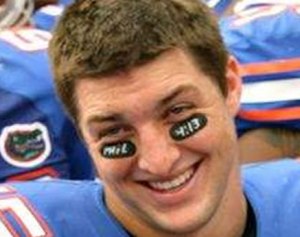 Anyhow, during the blowout win against FSU, the CBS announcer actually read the scripture verse Hebrews 12:12. It actually seemed to go well with Tebow’s fumble. The only problem was that Tebow had “Hebrews 12:1-2.” Some 10 minutes later, the CBS announcer apologized and read Hebrews 12:1 to all the viewers! Now he skipped verse 2, which mentions Jesus by name, but hey, not bad. All because of his eye black.