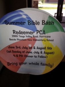 This summer will be the first year where Redeemer will actually have a building, and the question came about we would do for the children for summer time. The standard answer the past 50 years is quite simple: do a week long VBS. There is nothing wrong with that-nor there is nothing essentially right with that either. That’s why some churches in our area have done soccer camps, and one of the oldest churches is even switching to a 4 Sunday afternoon approach this year. Churches are free to dream and free to fail. The gospel gives us that freedom. And in response to that freedom, here is what we plan to do: Summer Bible Bash.